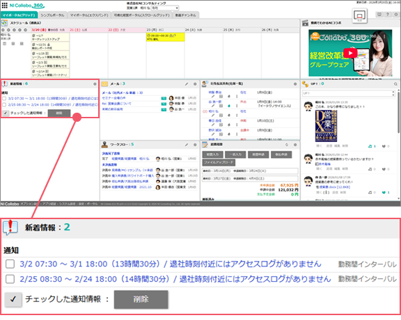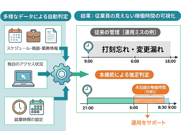 NI Collabo 360の「勤務間インターバル」機能は、タイムカードや勤怠管理(本人による打刻)を代替するものではなく、NI Collabo 360による活動データ(スケジュール、商談、業務情報)、アクセス状況(ログイン・稼働ログ)等も考慮して、「勤務間インターバル」の実態を推定し、必要なアラートを発報する機能です。これにより、打刻忘れや在席状況の変更漏れ、打刻後の就業があっても、就業状況を把握することができるようになります。(あくまでも推計であり、「勤務間インターバル」が取れているかどうかの判断材料を提供するものであることを予めご了承ください。)
